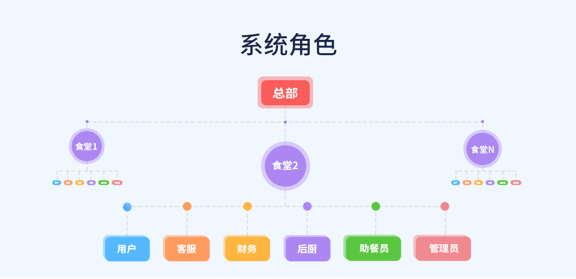 健康e族长者食堂配餐系统是一个以中央厨房为中心,各社区配餐点为抓手的星状管理体系,设计以管理员、后厨、 客服、助餐员与财务五个角色协同工作为基础,以提高效率、简化操作、降低人工成本和海量数据处理能力为目标的 全流程食堂配餐管理系统;系统以壹餐为管理单元,以订单为最小元素,对所有餐所有订单进行全生命周期管理,形成独立的大闭环小循环管理体系。